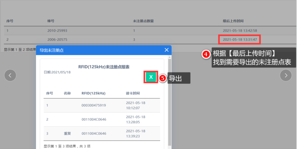 2.1 登录互联巡更平台,并参考下面2张图操作 2.2 点击导航条:【报表】>【巡更报表】>【未注册点报表】 2.3 将您在【将巡更棒中的记录上传到平台】 中记录的【上传记录时间】同该报表中【最后上传时间】进行对比,找出时间相近的那个条目,并用鼠标点击该条目,会弹出新窗口。 2.4 导出未注册点报表