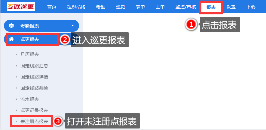 巡更棒中的记录被上传后,由于巡更点还未在互联巡更平台上注册,所以这些读点记录被保存到【未注册点报表】中。